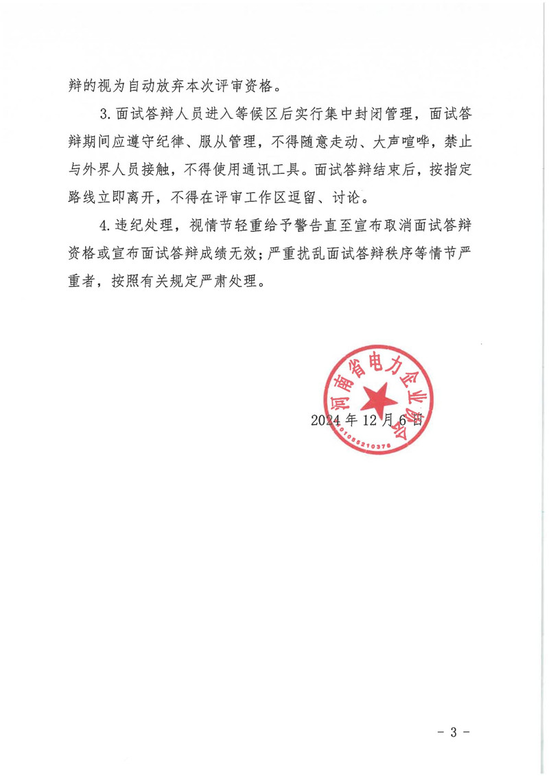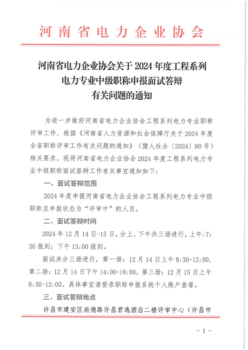 河南省电力企业协会关于2024年度工程系列电力专业中级职称申报面试答辩有关问题的通知