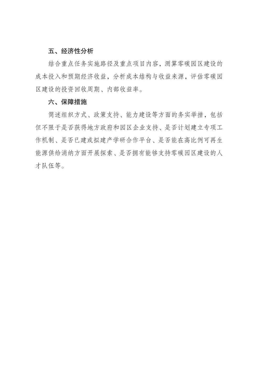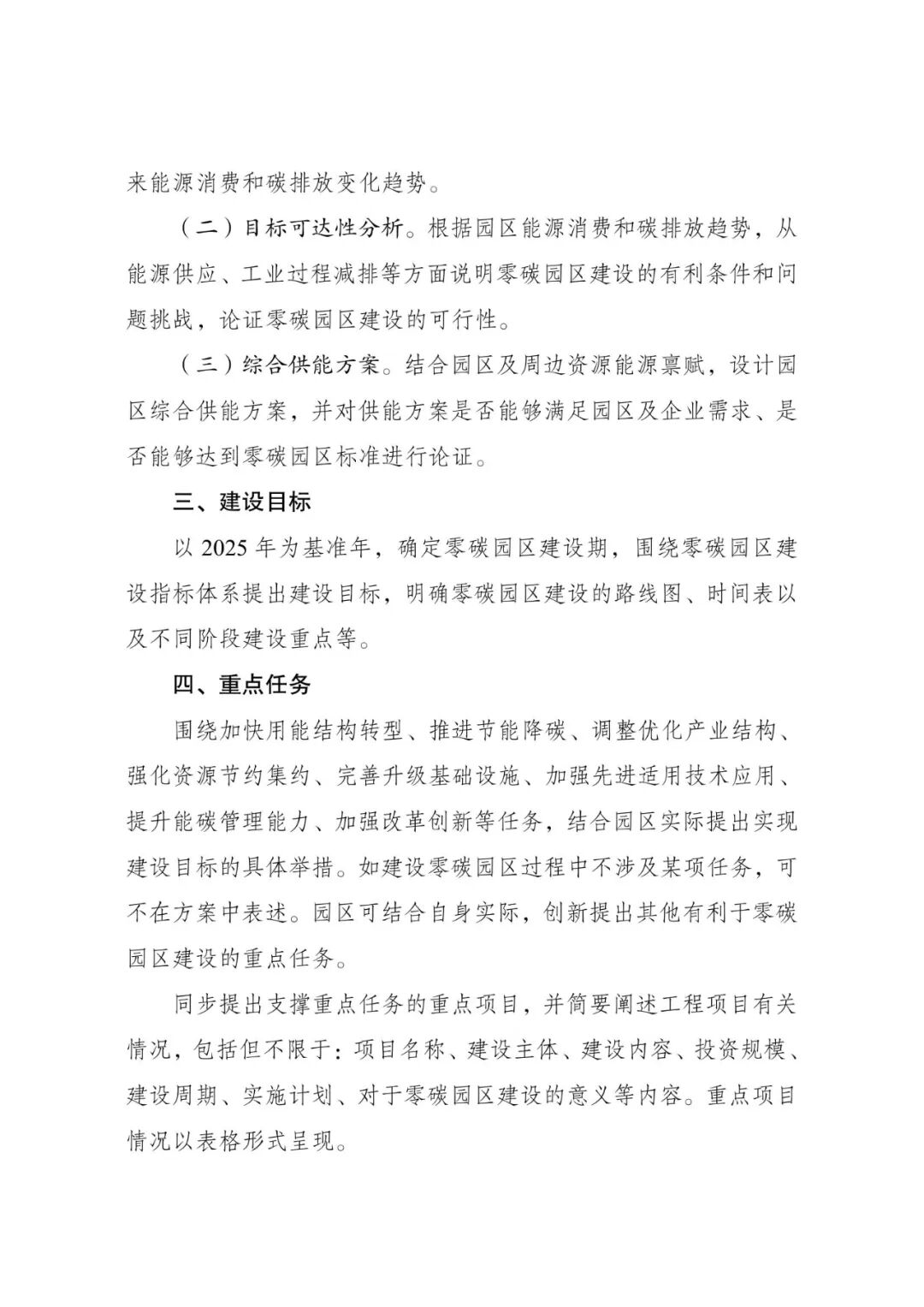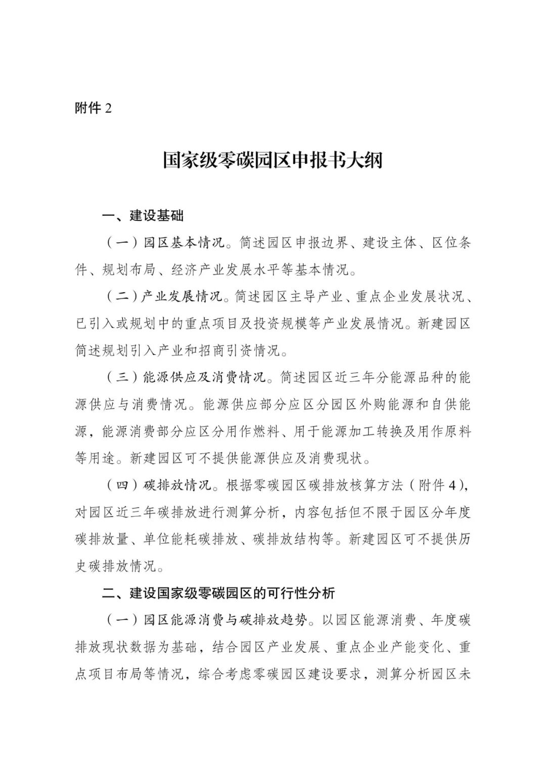 各省、自治区、直辖市发展改革委、工业和信息化主管部门、能源局:为贯彻落实党中央、国务院决策部署,积极稳妥推进碳达峰碳中和,加快经济社会发展全面绿色转型,支持有条件的地区率先建成一批零碳园区,逐步完善相关规划设计、技术装备、商业模式和管理规范,有计划、分步骤推进各类园区低碳化零碳化改造,助力园区和企业减碳增效,为实现碳达峰碳中和目标提供坚实有力支撑。现就零碳园区建设有关事项通知如下:(一)加快园区用能结构转型。加强园区及周边可再生能源开发利用,支持园区与周边非化石能源发电资源匹配对接,科学配置储能等调节性资源,因地制宜发展绿电直连、新能源就近接入增量配电网等绿色电力直接供应模式,鼓励参与绿证绿电交易,探索氢电耦合开发利用模式。推动园区积极利用生物质能、核能、光热、地热、工业余热等热能资源,实现供热系统清洁低碳化。探索氢能、生物质等替代化石燃料和原料。(二)大力推进园区节能降碳。推动园区建立用能和碳排放管理制度,深入推进企业能效碳效诊断评估,加强重点用能设备节能监察和日常监管,淘汰落后产能、落后工艺、落后产品设备。支持企业对标标杆水平和先进水平,实施节能降碳改造和用能设备更新,鼓励企业建设极致能效工厂、零碳工厂。(三)调整优化园区产业结构。鼓励园区加快自身产业结构优化调整,布局发展低能耗、低污染、高附加值的新兴产业,探索以绿色能源制造绿色产品的“以绿制绿”模式。支持高载能产业有序向资源可支撑、能源有保障、环境有容量的园区转移集聚,探索深度降碳路径。(四)强化园区资源节约集约。统筹规划园区及企业空间布局,提高土地资源集约利用水平,促进能量梯级利用、水资源循环利用。健全园区废弃物循环利用网络,推进工业固体废弃物、余压余热余冷、废气废液废渣资源化利用。(五)完善升级园区基础设施。优化园区基础设施规划设计,系统推进电力、热力、燃气、氢能、供排水、污染治理等基础设施的建设改造。推动新建建筑按照超低能耗建筑、近零能耗建筑标准设计建造。完善园区绿色交通基础设施,加快运输工具低碳零碳替代。(六)加强先进适用技术应用。支持园区与企业、高校、科研机构开展深度合作,加强科技成果转化应用,探索绿色低碳技术研发与产业发展深度融合机制,围绕低碳零碳负碳先进适用技术打造示范应用场景,形成具有商业价值的技术解决方案。(七)提升园区能碳管理能力。支持园区建设覆盖主要用能企业的能碳管理平台,强化园区及企业用能负荷监控、预测与调配能力,为碳排放核算、源网匹配调节、电力需求侧管理、多能协同互补、资源高效循环利用等工作提供支撑。(八)支持园区加强改革创新。支持地方政府、园区企业、发电企业、电网企业、能源综合服务商等各类主体参与零碳园区建设,围绕实现高比例可再生能源供给消纳探索路径模式。鼓励有条件的园区以虚拟电厂(负荷聚合商)等形式参与电力市场,提高资源配置效率和电力系统稳定性。国家发展改革委将统筹利用现有资金渠道支持零碳园区建设,鼓励各地区对零碳园区建设给予资金支持,通过地方政府专项债券资金等支持符合条件的项目。鼓励政策性银行对符合条件的项目给予中长期信贷支持。支持符合条件的企业发行债券用于零碳园区建设。支持园区引入外部人才、技术和专业机构,服务企业节能降碳改造、碳排放核算管理、产品碳足迹认证等。探索对零碳园区多能互补、多能联供项目实行“一个窗口”审批制度。强化用能要素保障,在零碳园区范围内创新节能审查和碳排放评价模式,探索实施区域审批或项目备案。加强新建园区、新能源电源、供电设施等用地用海要素保障。(一)加强统筹协调。国家发展改革委统筹推进零碳园区建设,持续深化相关领域改革创新,在试点探索、项目建设、资金安排等方面对零碳园区建设给予积极支持。工业和信息化部指导各地区推进工业园区低碳化改造,推动具备条件的工业园区建设零碳园区。国家能源局指导各地区加强零碳园区绿色能源供给体系建设和改革创新,推动园区供用能模式变革。各地区发展改革委要会同本地区工业和信息化、能源主管部门等结合实际抓好工作落实。(二)组织园区申报。在综合考虑能源禀赋、产业基础、电力安全可靠供应、减碳潜力等因素基础上,各地区发展改革委要会同本地区工业和信息化、能源主管部门等推荐有条件、有意愿的园区建设国家级零碳园区(基本条件见附件1),并指导园区综合分析项目可行性,测算经济、环境、社会效益,按要求编制申报书(大纲见附件2)。各地区推荐园区数量不超过2个,于8月22日前将推荐园区名单及建设方案报送国家发展改革委(环资司)。(三)扎实开展建设。国家发展改革委会同有关方面对地方推荐园区的建设方案进行审核,统筹考虑产业代表性、综合示范性、碳减排潜力等因素,确定首批国家级零碳园区建设名单。对于纳入建设名单的园区,各地区发展改革委要加强工作指导,协调解决困难问题。各地区可结合实际开展省级零碳园区建设。(四)加强评估总结。国家级零碳园区建设期满后,由省级发展改革委组织开展自评估。自评估符合要求的,由国家发展改革委组织有关部门和单位开展评估验收(指标体