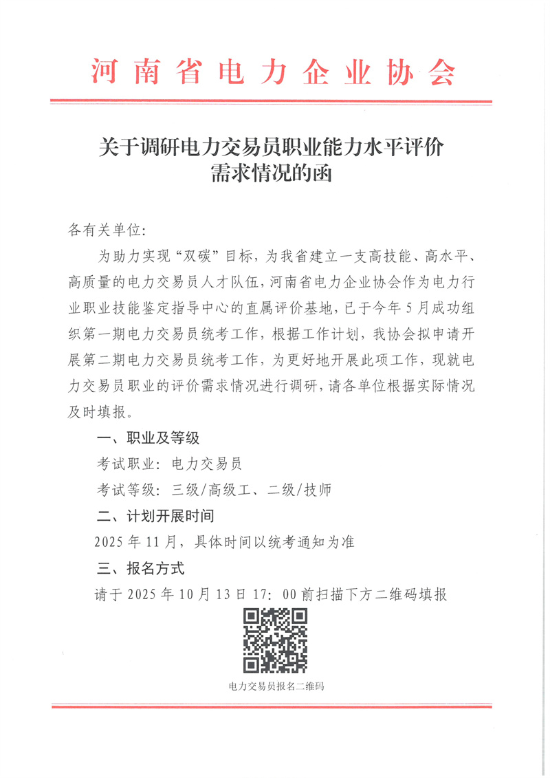 关于调研电力交易员职业能力水平评价需求情况的函