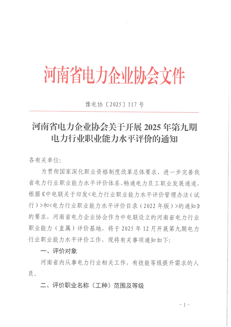 河南省电力企业协会关于开展2025年第九期电力行业职业能力水平评价的通知