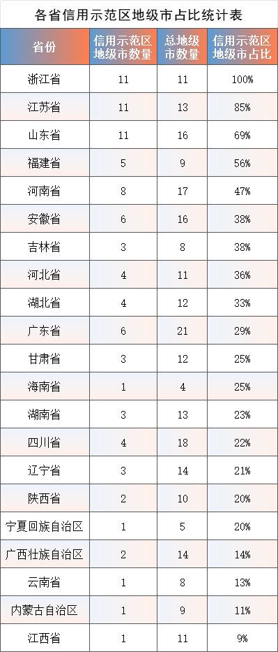 全国各省信用示范区地级市占比呈现较大差异。浙江省15个示范区实现全省11个地级市全覆盖,成为全国首个信用建设市域全覆盖的省份。江苏、山东紧随其后,占比均超过68%,中部省份如河南、安徽、湖北等占比在33%-47%之间,数据显示,东部沿海地区信用示范区地级市覆盖率高于中西部地区。