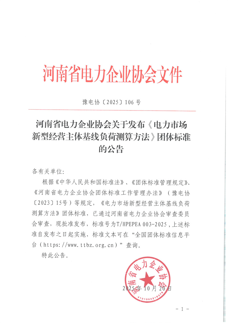 河南省电力企业协会关于发布《电力市场新型经营主体基线负荷测算方法》团体标准的公告