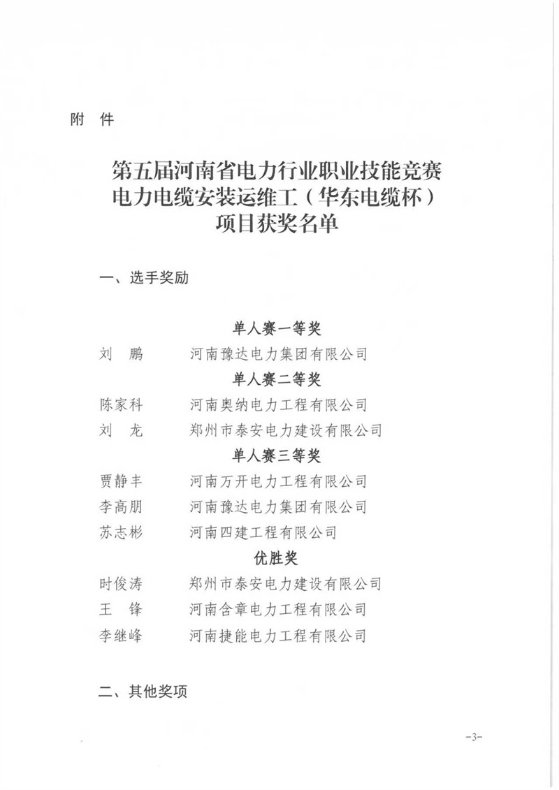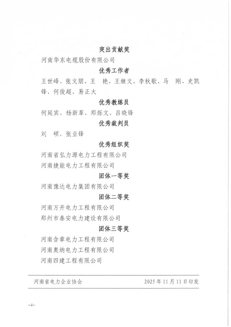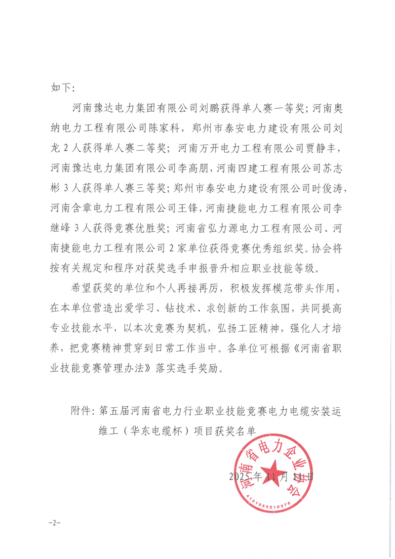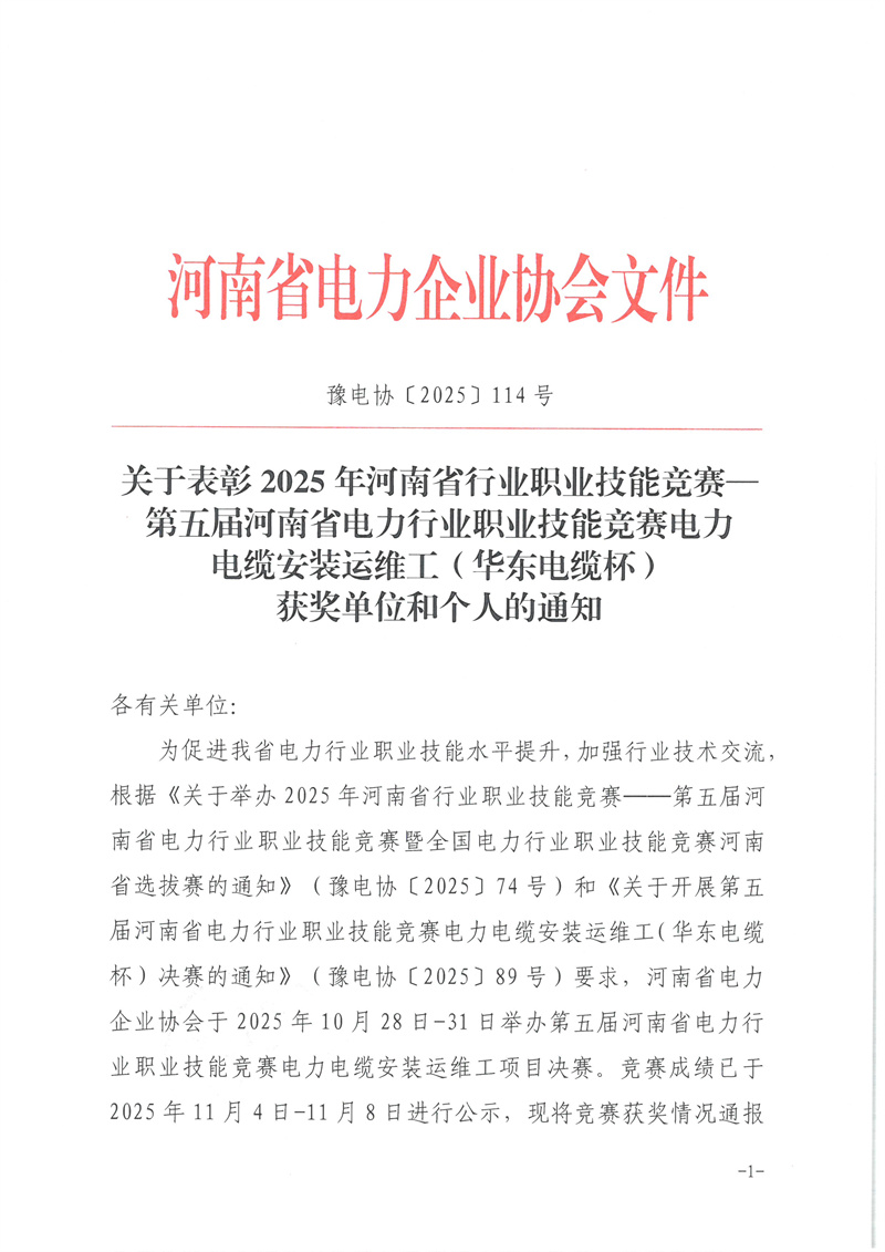 关于表彰2025年河南省行业职业技能竞赛─ 第五届河南省电力行业职业技能竞赛电力电缆安装运维工(华东电缆杯)获奖单位和个人的通知