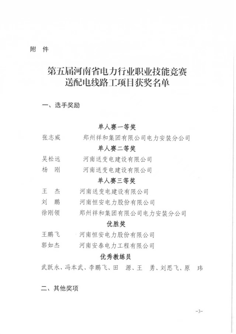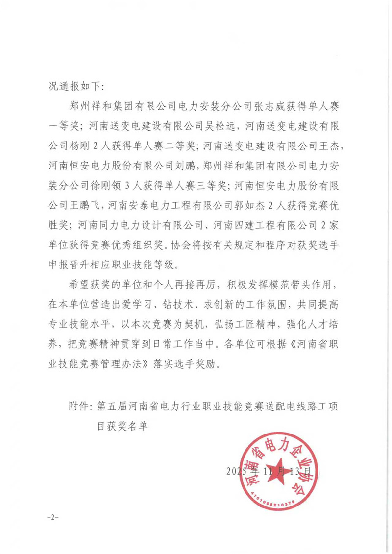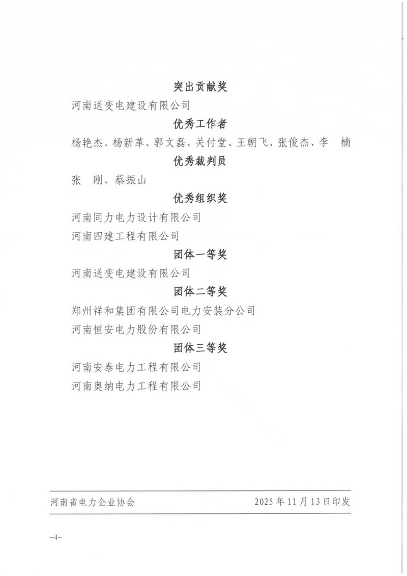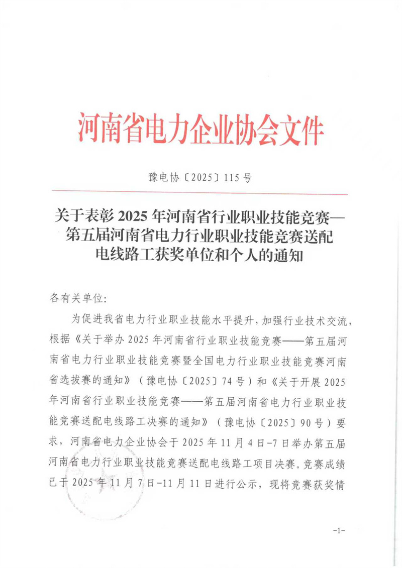 关于表彰2025年河南省行业职业技能竞赛──第五届河南省电力行业职业技能竞赛送配电线路工获奖单位和个人的通知