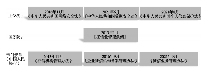 近年来,《中华人民共和国数据安全法》《中华人民共和国个人信息保护法》《征信业务管理办法》等法规密集出台,个人征信相关法制框架持续完善(见下图1),为个人征信行业高质量发展奠定了坚实的基础。