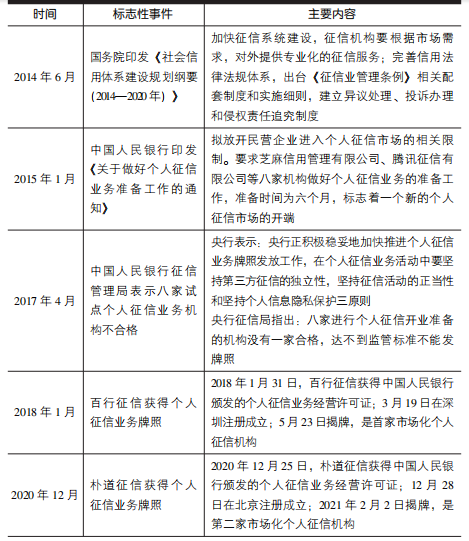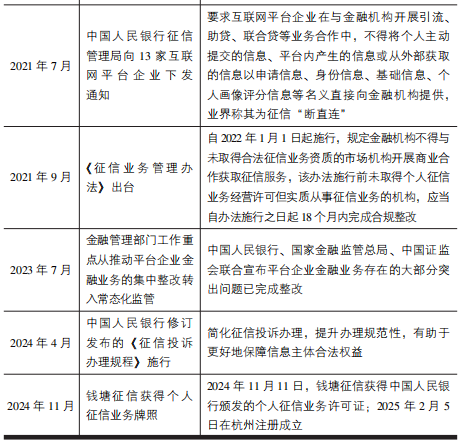 随着《征信业务管理办法》的实施,征信“断直连”按期推进,个人征信行业正本清源,发展更加规范,征信体系供给能力和运行质效进一步提升,标志性事件见下表。