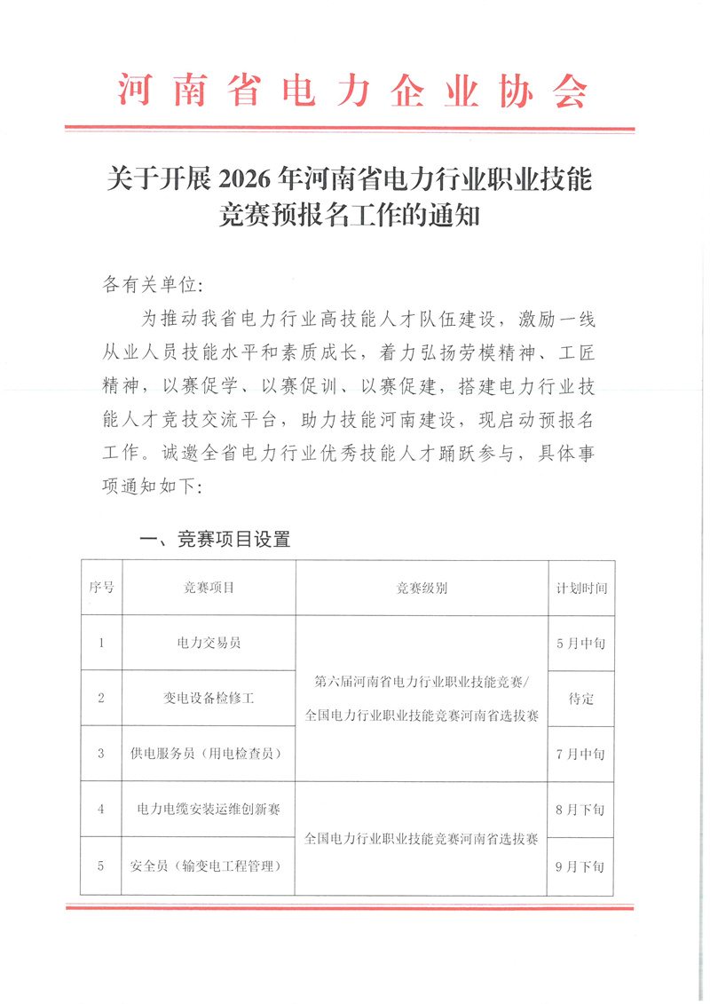 关于开展2026年河南省电力行业职业技能竞赛预报名工作的通知