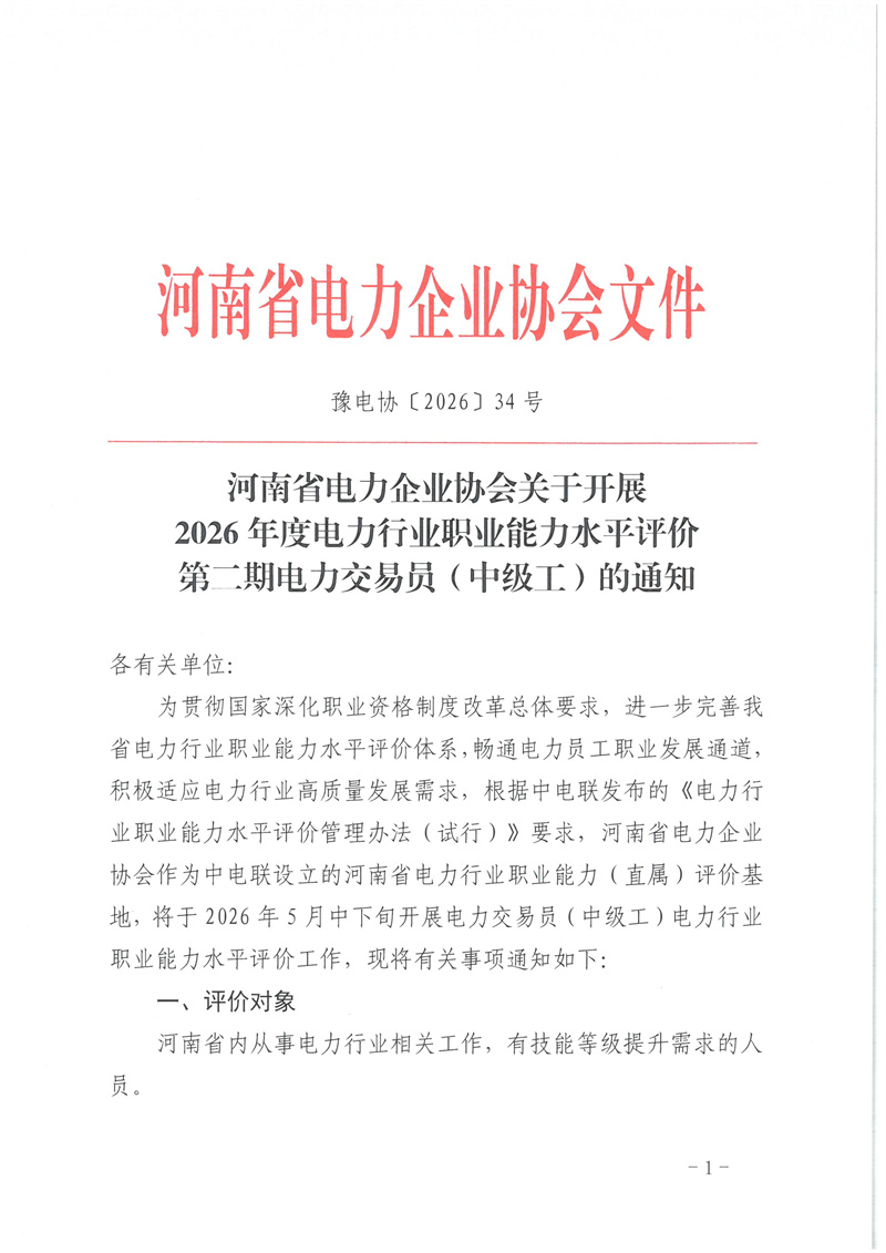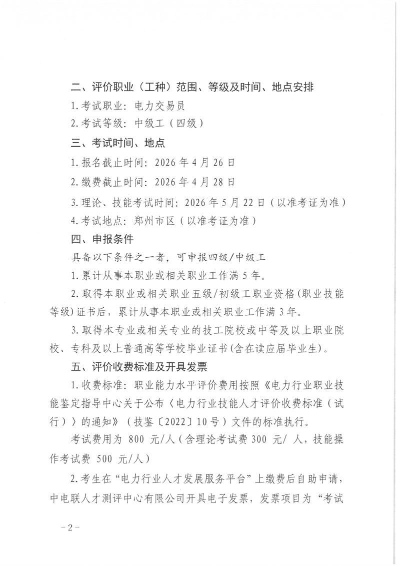 关于开展2026年度电力行业职业能力水平评价第二期电力交易员(中级工)的通知