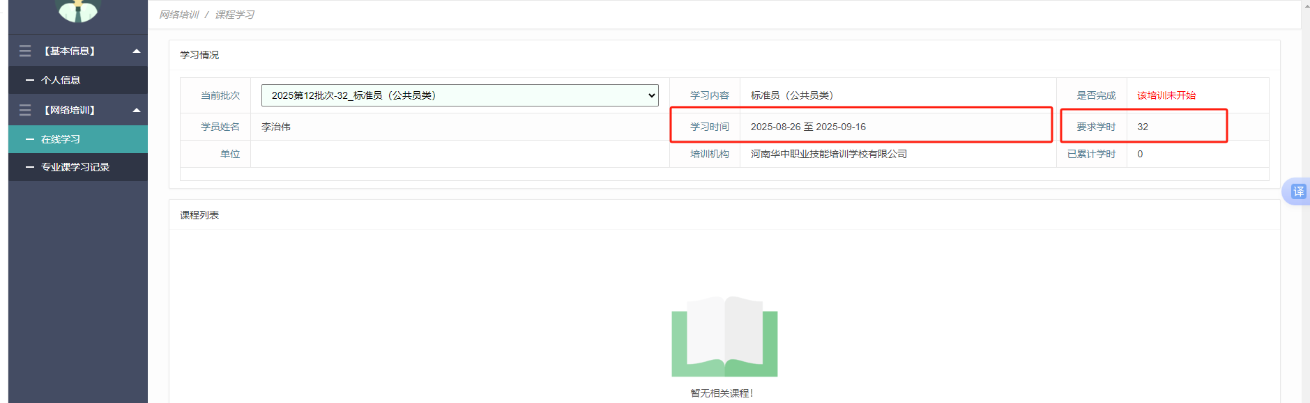 登录成功后,点击正在学习的课程开始学习,在规定的培训时间内完成64学时的学习。